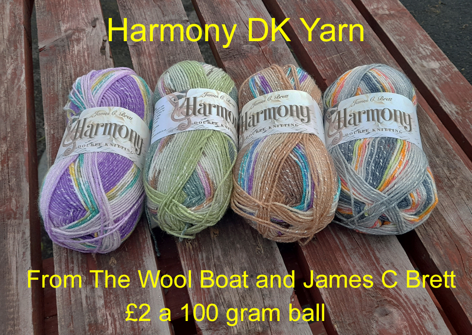 Capt Col has been into the store room and found some supplies of “Harmony” that James C Brett produced a while back. We have 4 shades available, at £2 a 100-gram ball.