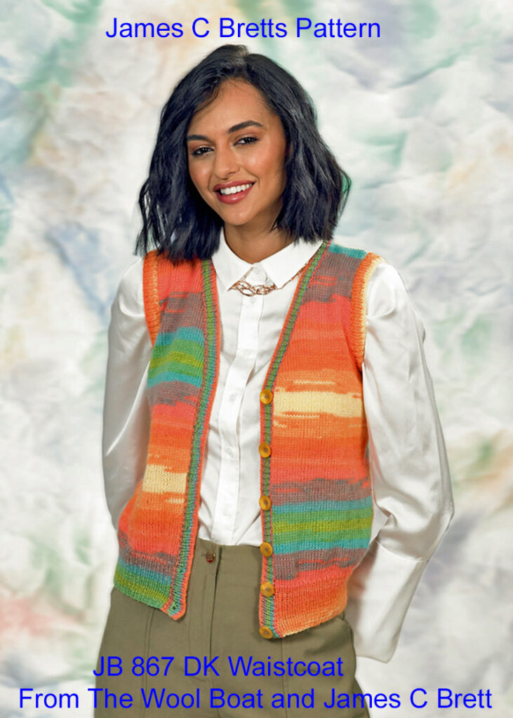 Saturday morning inspiration, new into stock on the boat, 2 waistcoat patterns and a new shade of Baby Twinkle Prints dk, “Citrus Sorbet”.
